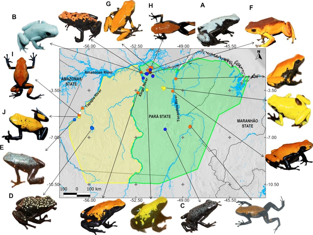 The study species of poison frog, A. galactonotus, are usually grouped into colour categories of yellow, orange, blue, red, and brown. The colour of the frogs is a warning signal to predators, advertising their toxicity. Interestingly multiple frog colours are not observed in a single area. A single population will consist of only one of the colour categories. Found in east Amazonia, this species does not show clear boarders in colour (i.e. blue in west, yellow in east, etc…) instead forming a mosaic pattern. Below is a figure from the paper which shows the sampling areas split east and west by the Xingu river and demonstrates the mosaic pattern of colour distributions.