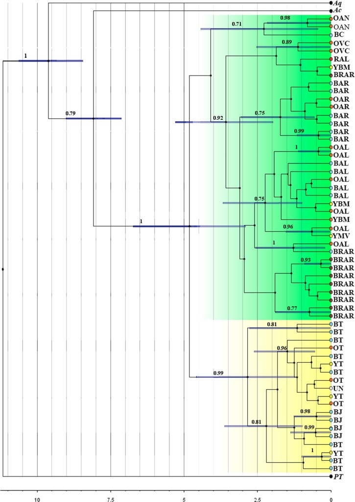 Looking at genetics, they looked to track the divergence of A. galactonotus and see if it matched with how colour was distributed, but they found no strong link between the two. They also used the genetic data to produce a tree which mapped the divergence, showing were different populations separated out from each other (shown below). A key observation from this being that there are two distinct groups formed equating to either side of the Xingu river. This suggests the river acts as a barrier to genes spreading among the species.